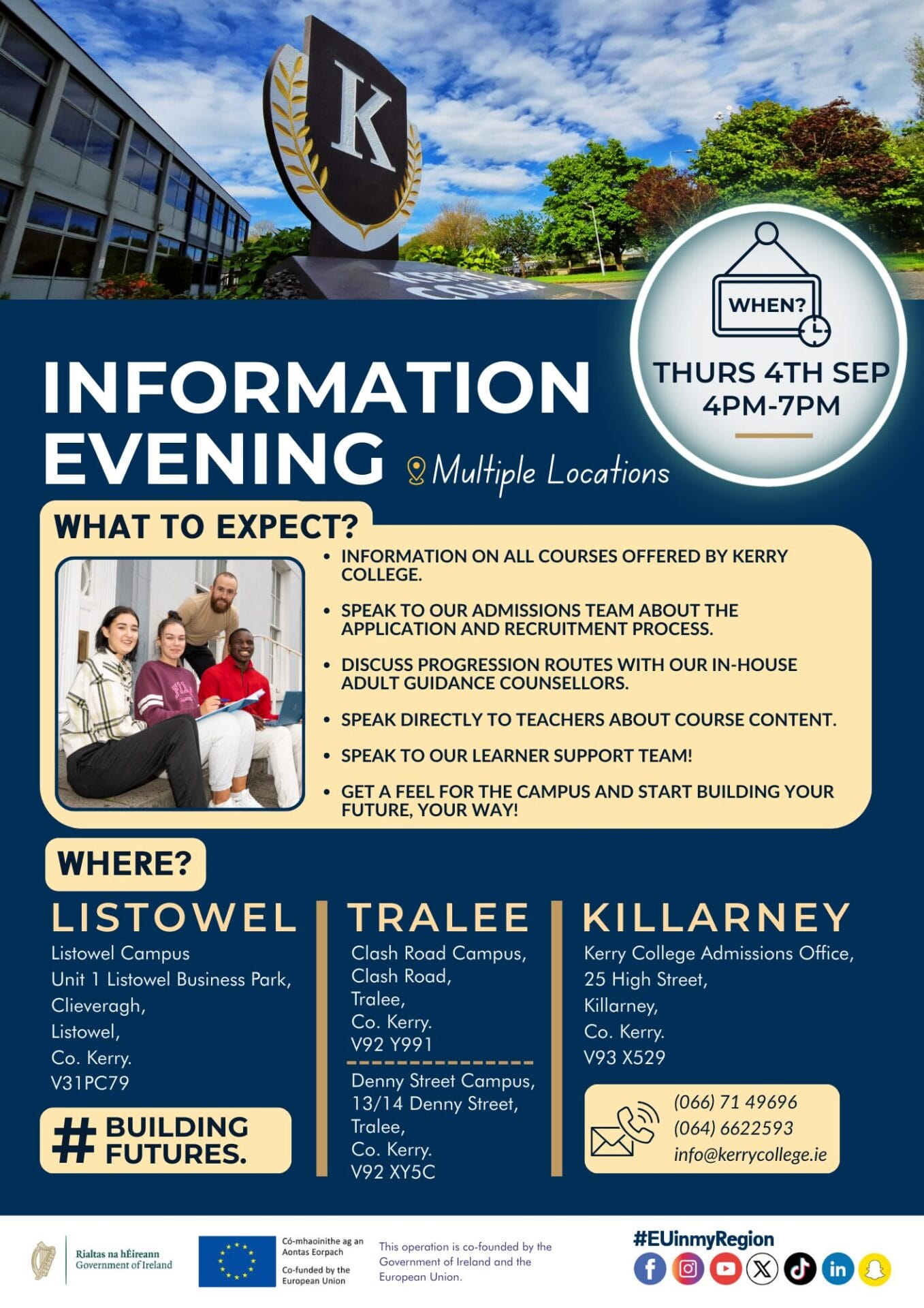Are you ready to take the next step toward your future? Kerry College is inviting prospective learners, parents, and the wider community to its Information Evening on Thursday, September 4th, from 4–7 PM across multiple campus locations in Listowel, Tralee, and Killarney.